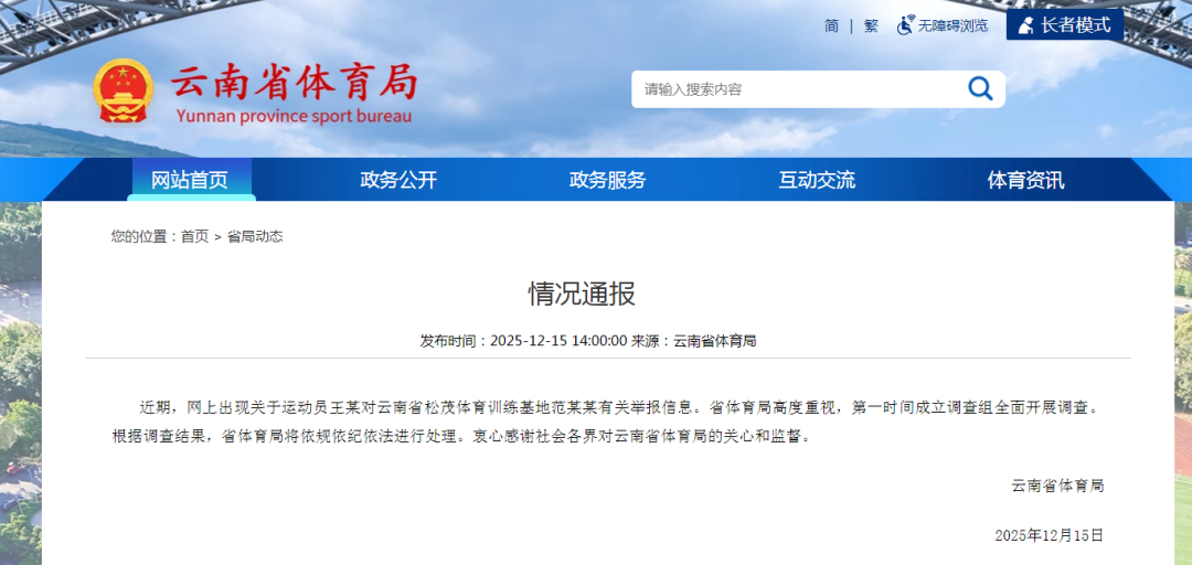 12月15日,云南省体育局发布情况通报: